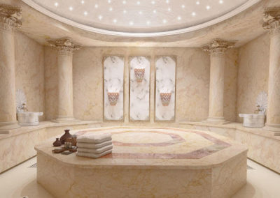 - 進入浴室後,將浴巾擺在一旁,躺在中心的大理石平台上休息片刻,讓熱蒸氣幫助打開全身的毛孔,放鬆心情。